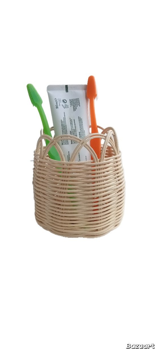 Diş fırçası ve macun gibi küçük eşyalar için uygun, açık renkli ve doğal görünümlü rattan saklama sepeti.