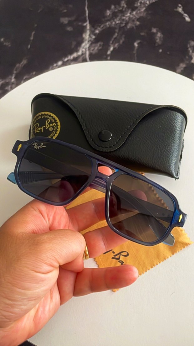 Ray-Ban erkek güneş gözlüğü, koyu mavi çerçeve ve degrade camlarla klasik streetwear tarzı. Siyah deri kılıf ve temizleme bezi ile birlikte.
