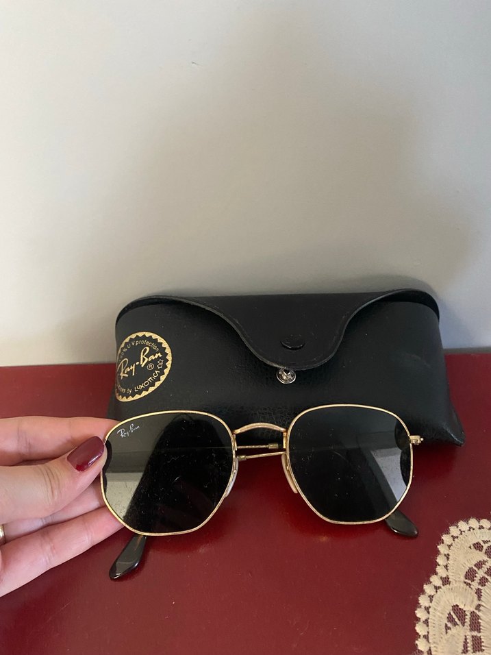 Ray-Ban markalı parlak altın çerçeveli güneş gözlüğü, klasik ve streetwear tarzında. Siyah deri kılıf ile birlikte. ️