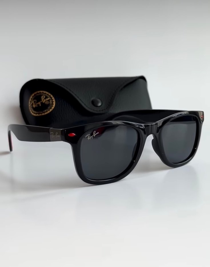 Ray-Ban siyah erkek güneş gözlüğü, klasik sokak stili ve koyu renk camlarla. Koruyucu kılıfı ile birlikte gelir.