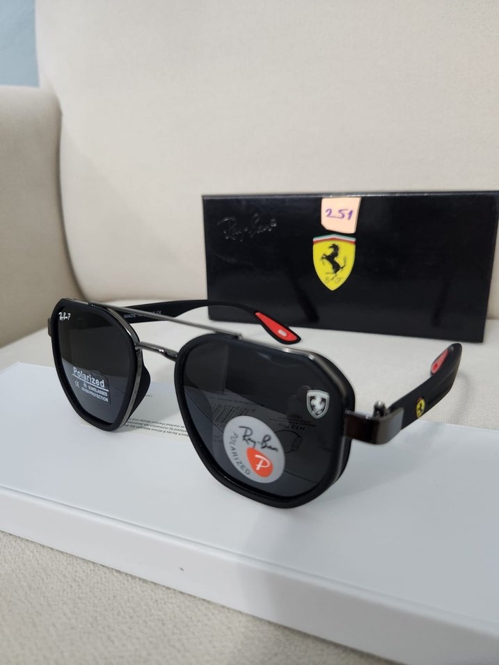 Ray-Ban erkek güneş gözlüğü, siyah çerçeve ve renkli kırmızı detaylara sahip, polarize camlı klasik streetwear tarzı. ️