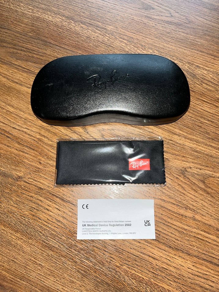 Ray-Ban markalı, siyah minimalist gözlük kılıfı. Velcro kapamalı, yanında temizleme bezi ve kullanım bilgisi bulunur. ️