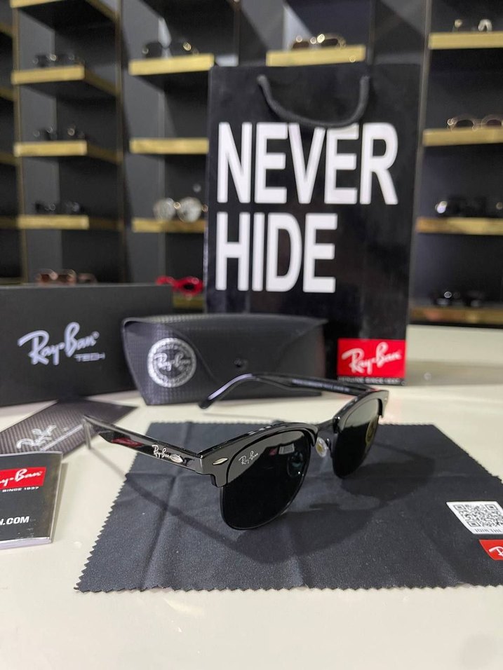 Ray-Ban markalı erkek güneş gözlüğü, siyah çerçeve ve gri camlı klasik sokak stili tasarımı ile. Kılıf, temizleme bezi ve kutu ile birlikte.