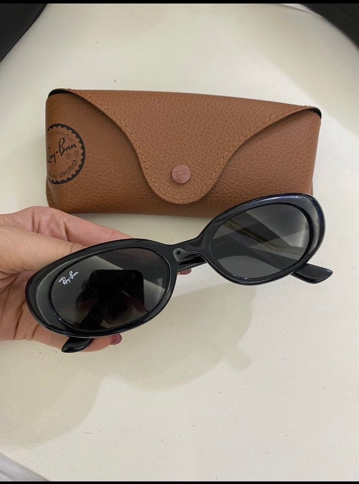 Ray-Ban siyah oval çerçeveli kadın güneş gözlüğü,kahverengi deri kılıfla birlikte.