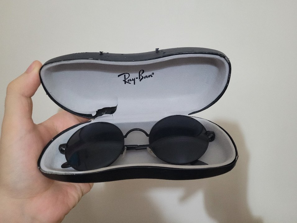 Ray-Ban siyah yuvarlak güneş gözlüğü, fermuarlı kutu ile birlikte, minimal, bohem ve gotik tarzlara uygun koyu renkte.