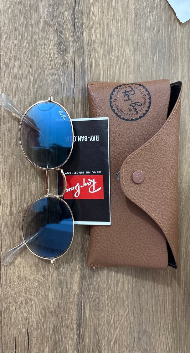 Ray-Ban markalı, parlak mavi camlı, yuvarlak gri çerçeveli vintage kadın güneş gözlüğü. Retro ve bohem tarzını yansıtan model, kahverengi deri kılıf ile birlikte. bezini kullandım bezi yok orijinal üründür.