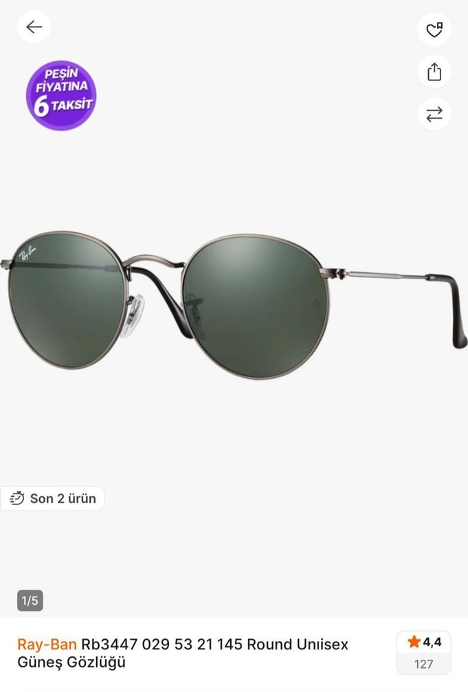 Ray-Ban yuvarlak unisex güneş gözlüğü, şeffaf gri çerçeve ve koyu camlarla klasik ve çağdaş stil sunar.