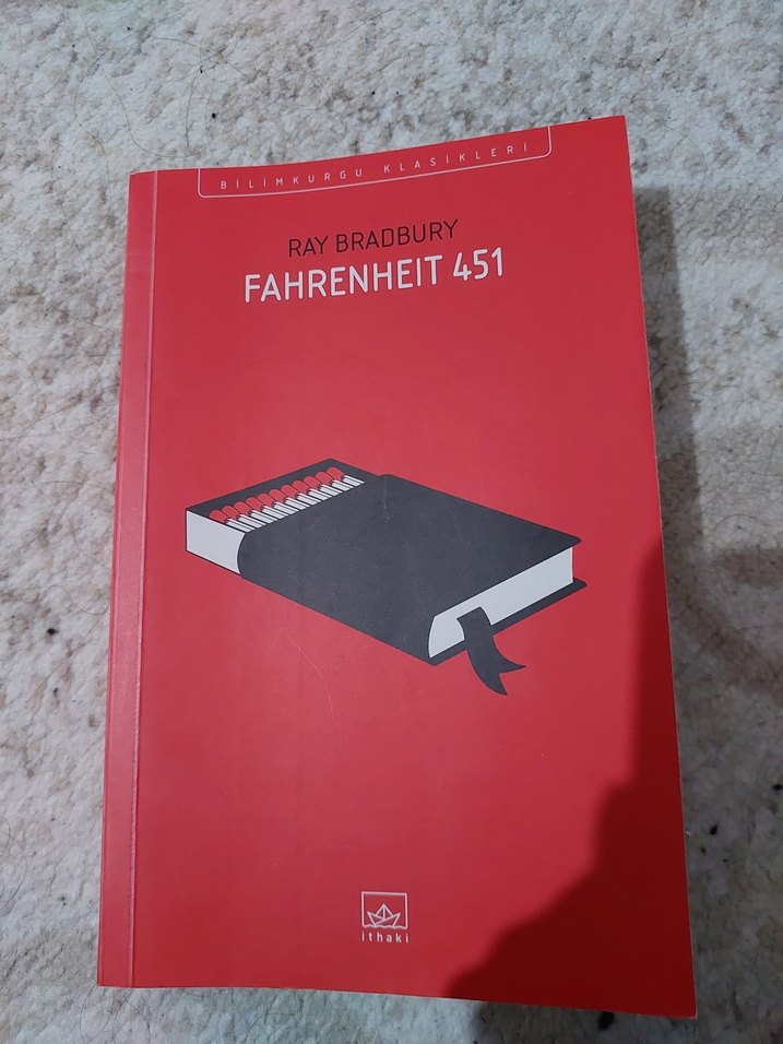 Ray Bradbury'nin Fahrenheit 451 adlı klasiği, kırmızı kapaklı ve kibrit kutusu çizimli bir romandır.