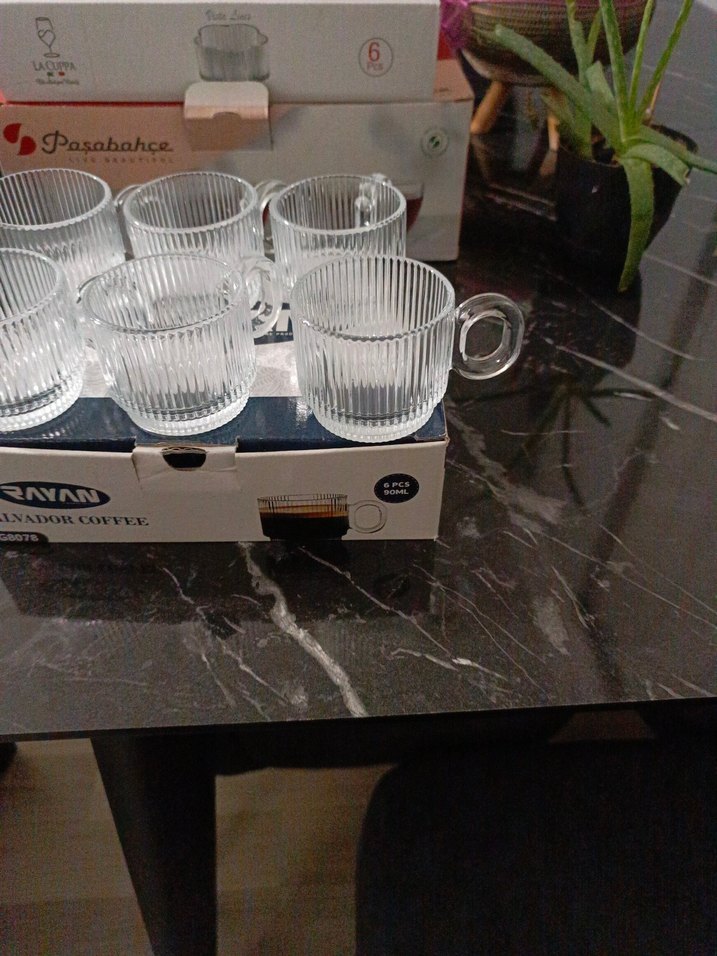 RAYAN markasına ait, kulplu ve çizgili tasarıma sahip 6'lı beyaz cam kahve fincanı seti. Basit ve şık görünüm sunar. ☕