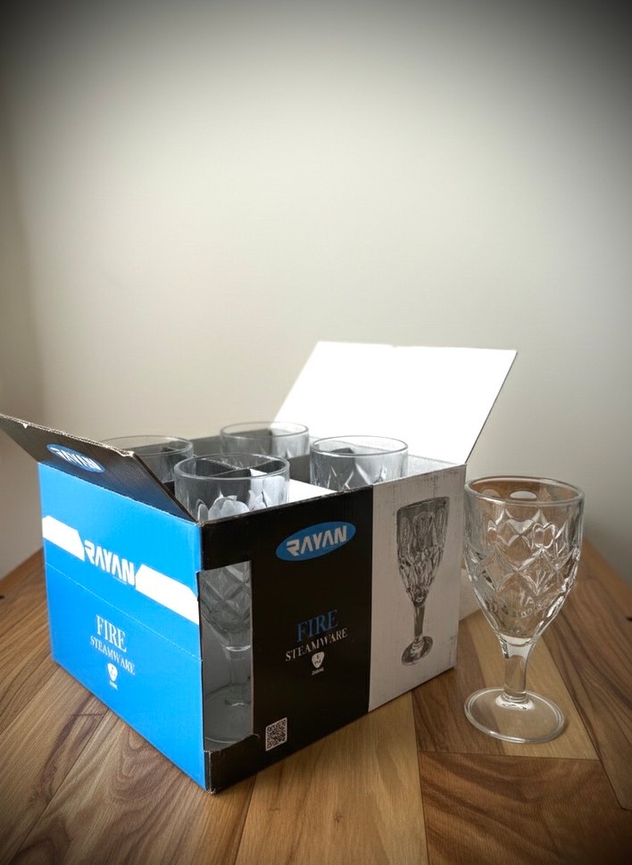 Rayan markasına ait, koyu desenli beyaz kristal görünümlü 6'lı kadeh seti, şık sunumlar için uygundur. 250mL Hiç kullanılmamıştır