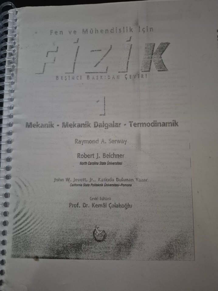 "Physics For Scientist and Engineers with Modern Physics" kitabının 5. Baskı çevirisi. Fotoğraflarda görüldüğü gibi 1 sayfaya 2 sayfa sığacak şeklinde ciltlenmiştir. Görebildiğim kadarıyla hiçbir çizik/yazı/karalama bulunmamakta. Sadece altında kahve lekesi ve küçük yıpranmalar var. Sayfalarda yazıyı okumayı asla engellemez