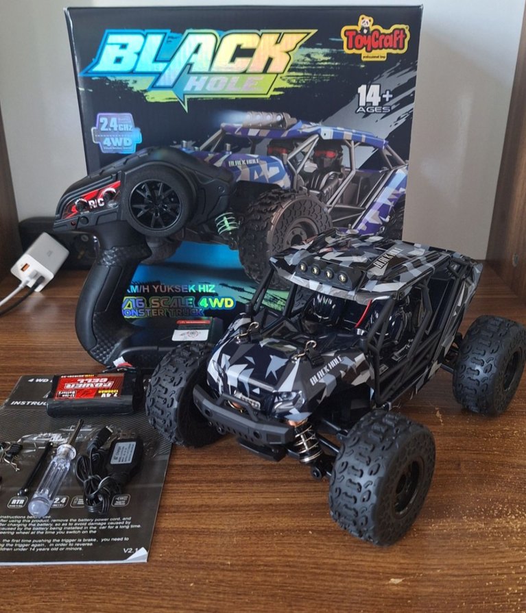 1:16 Ölçek . 4X4 .Maksimum stock hali ile 55 Km/H hızı geçebilmektedir.Su geçirmez Esc ile her alanda kullanım. Üst kalite malzemeden yapılmış esnek şasesi ve alaşımlı şaft kolu ile yüksek hızlarda bile dengeli gidebilmektedir. Kumandadan Trim ayarlı hassas servo ile dengeli dönüşler yapmaktadır. 7.4V 1200 Mha yüksek kapasiteli pil. Kayma yapmayan kauçuk özel lastikler ile sert zemine çok iyi tutunmaktadır. Özel esnek katlanma yapmayan kep. Güçlü led far ile gece rahatlıkla kullanım. 100 metre kumanda çekim mesafesi. Soğutmalı 380 brushed özel güçlü motor. Pil şarj kablosu, 1200 MHA 7.4 V pil, bijon alyanı , yedek şaft kolu ve kullanım kılavuzu ile beraber gelmektedir.
