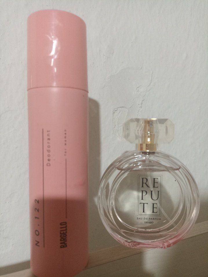RE kadın parfümü ve Barcello deodorant sprey seti. Parfüm yuvarlak şeffaf şişede, deodorant pembe silindirik kutuda.