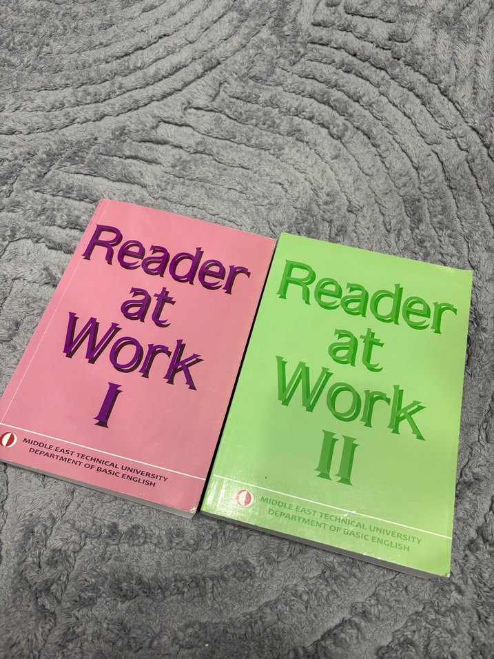 Reader at Work I ve II, Orta Doğu Teknik Üniversitesi tarafından hazırlanan temel İngilizce öğrenim kitaplarıdır. Pembe olanın birazi yapılı bir kaç sayfa kalanlar bomboş.