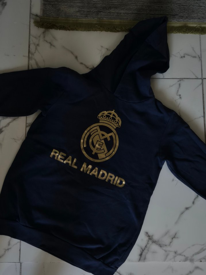 Kapüşonlu, uzun kollu ve fermuarlı erkek sweatshirt. Koyu renkte, yumuşak ve sıcak tutan fleece kumaş üzerine altın renkli Real Madrid baskısı bulunur. Rahat kesim, trend günlük stil için uygundur.