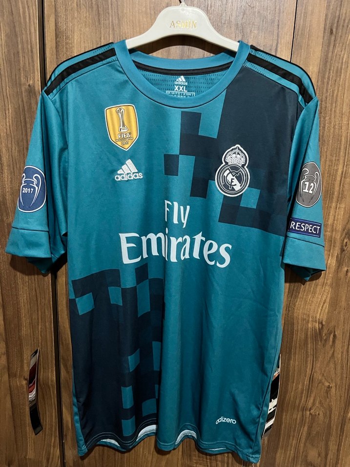 Erkekler için koyu mavi, kısa kollu, yuvarlak yakalı, bol kesim Real Madrid forması. Sentetik kumaştan, baskılı desenli ve cırt cırt detaylı, spor için uygun.