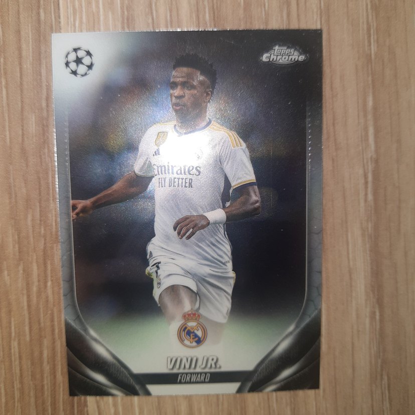 Topps Chrome futbol kartı, Real Madrid forveti Vini Jr.'yi beyaz takım forması ve 'Emirates Fly Better' sponsoruyla gösteriyor. ⚽