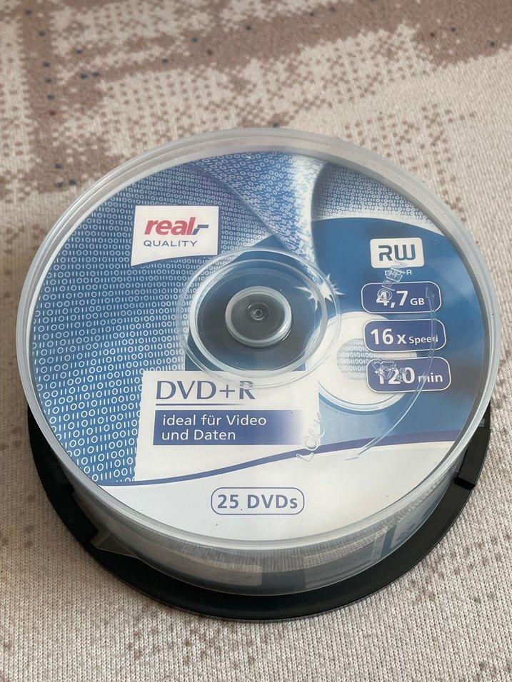 Real Quality DVD+R diskler, 4.7 GB kapasite ve 120 dakika kayıt süresi ile video ve veri için uygundur. 16x hızında, 25'li paket.