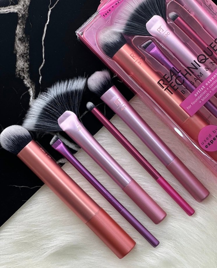 Yumuşak kıllara ve pembe saplara sahip çeşitli makyaj fırçalarından oluşan set, hassas makyaj uygulaması için uygundur.