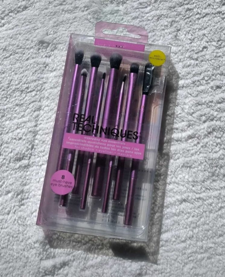Sekiz adet mor makyaj fırçası içeren set, göz makyajı için farklı fırça şekillerine sahiptir. Koyu mor sapları ve yumuşak kılları vardır. ️