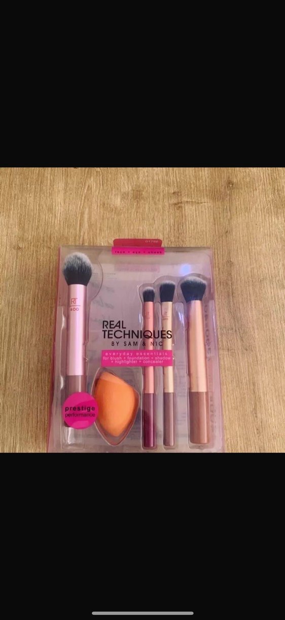 Real Techniques'ten yumuşak kıllı, çeşitli boylarda pudra fırçaları ve makyaj süngeri içeren pembe makyaj fırça seti.