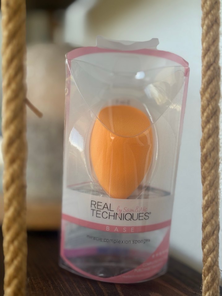 Real Techniques markasına ait turuncu tonlarda, yumuşak dokulu makyaj süngeri, baz uygulaması için uygundur.