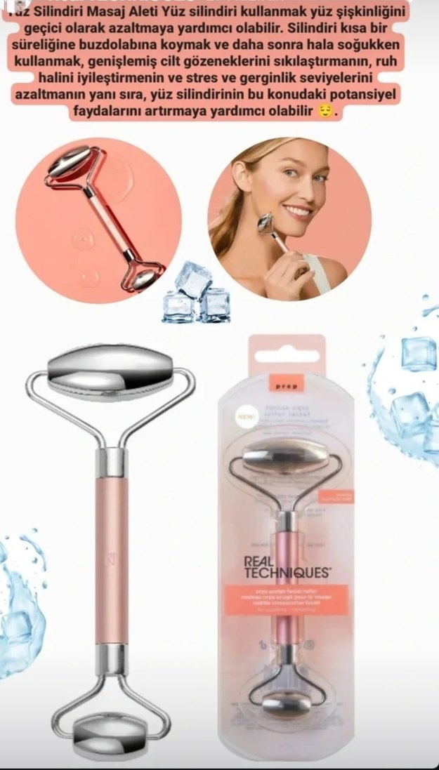 Real Techniques yüz masaj silindiri, cilt görünümünü iyileştirmeye ve stres ile gerginlik seviyelerini azaltmaya yardımcı olur, buz uygulamasıyla faydaları artırılabilir. ❄️
