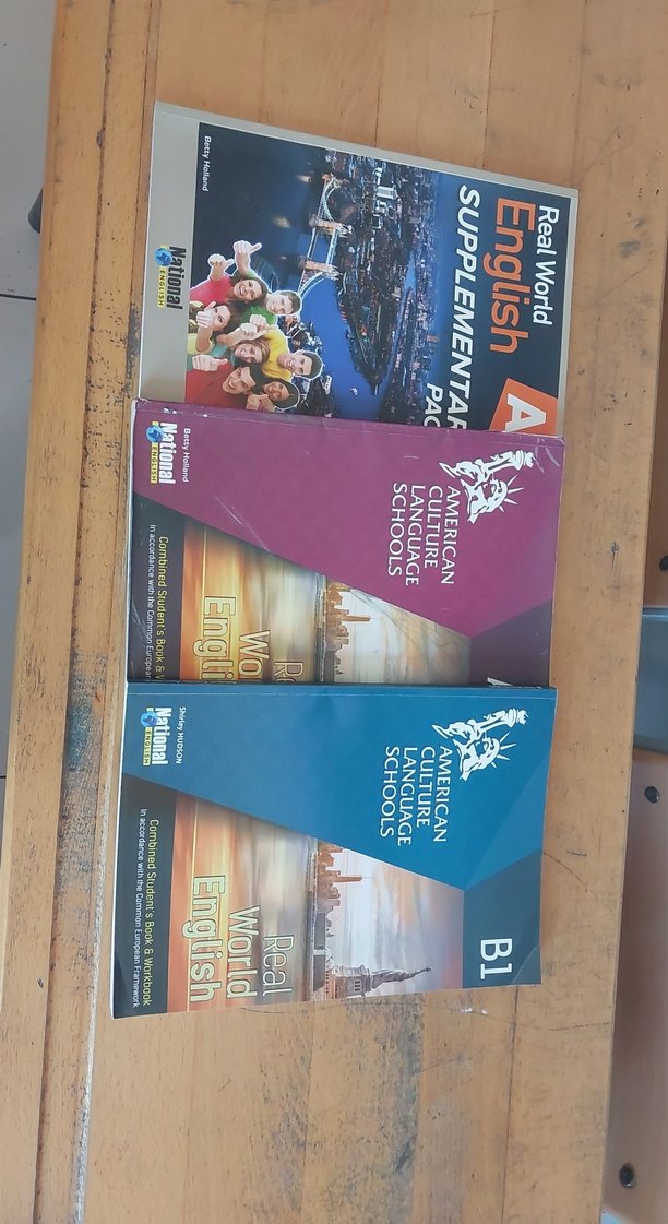 A1 ve B1 seviyelerinde Real World English ve American Cultural Language Schools kitaplarından oluşan lise İngilizce kitapları seti. Sadece American Kültür A2 de biraz yıpranma var.