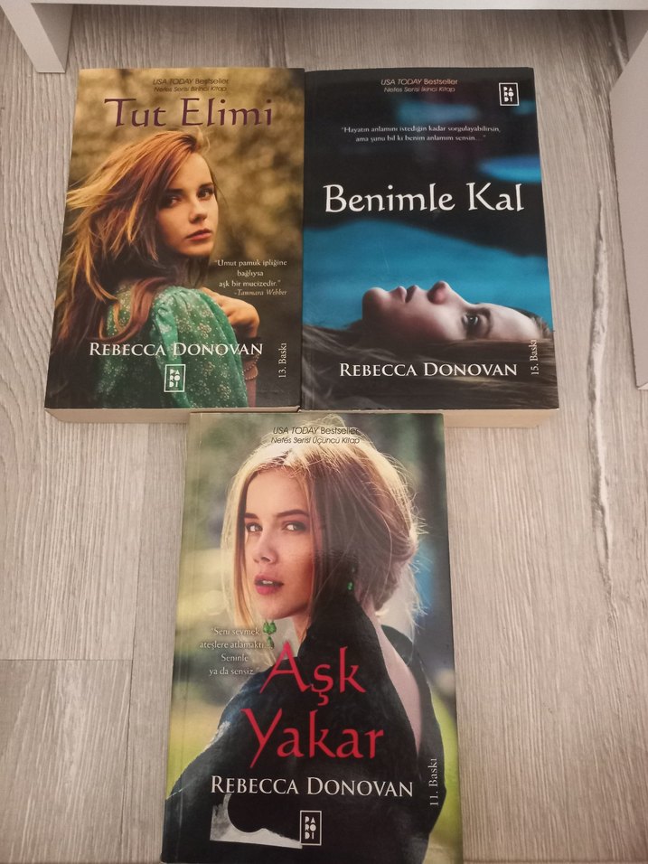 Rebecca Donovan'un 'Tut Elimi', 'Benimle Kal' ve 'Aşk Yakar' kitaplarından oluşan üçlü set. Duygusal hikayeler içerir.