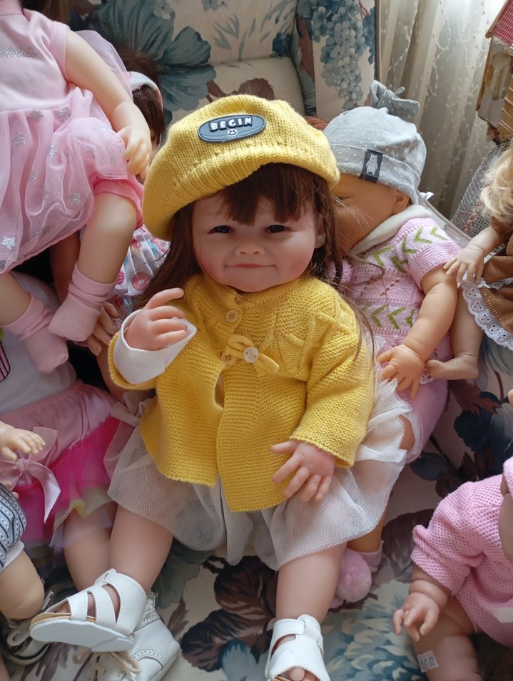 Bu bebek, yumuşak sarı örme kazak ve 'BEGIN' etiketi olan bere ile ışık renkli etek ve beyaz sandaletler giyiyor. Gerçekçi yüz ve kahverengi saça sahip. 55 cm. full silikon. sertifikası, biber onu, emziği ile birlikte.