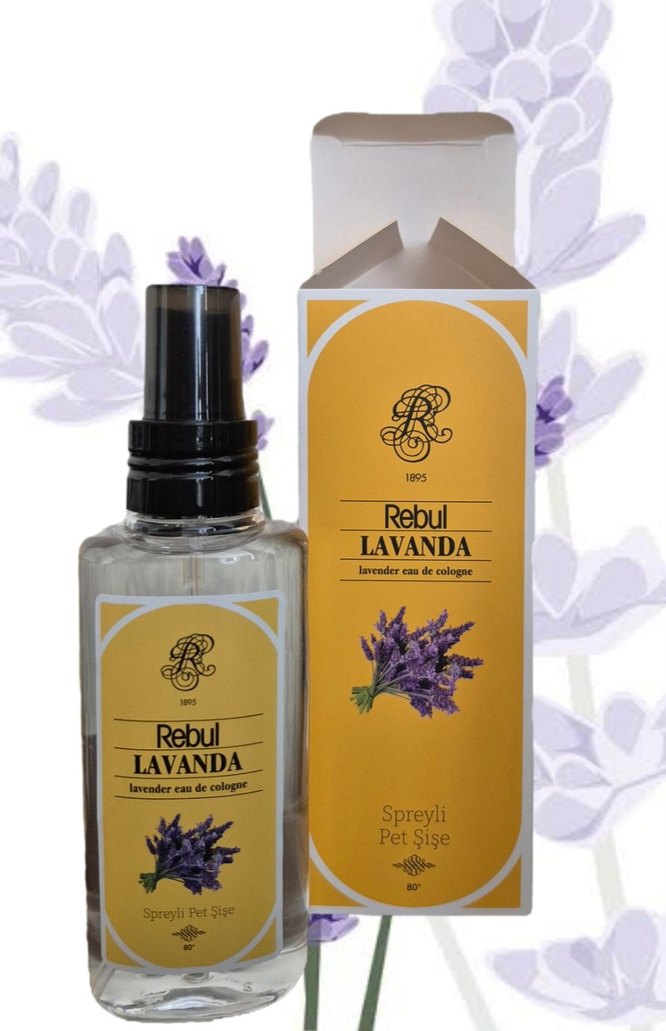 Rebul Lavanda kolonyası, lavanta kokulu spreyli 80° pet şişede sunulmuştur.