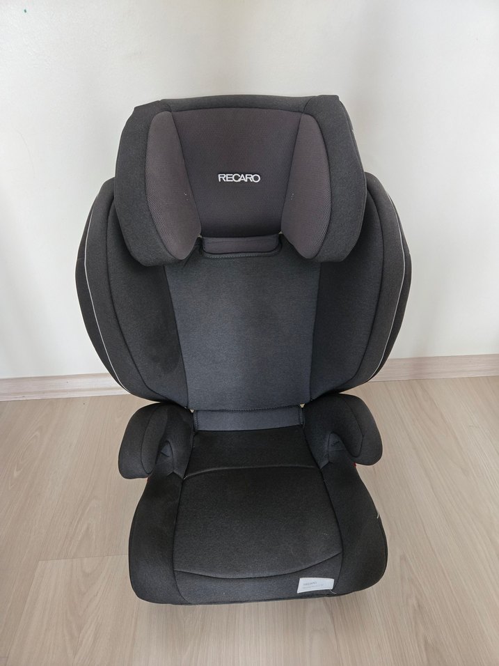 RECARO çocuk araç koltuğu, siyah ve gri renklerde olup, konfor ve güvenlik için yastıklı yan desteklere sahiptir. 15-36 kg