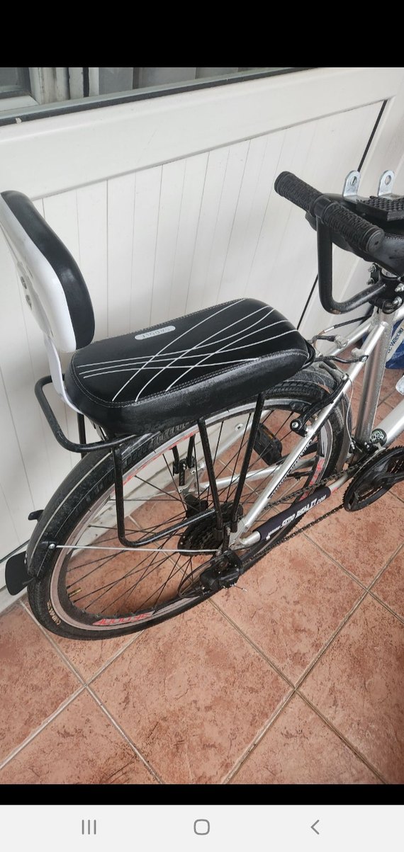 Beyaz ve gri renklerde, siyah dikişli yastıklı oturma yeri ve sırt dayanağı bulunan üç tekerlekli bisiklet çocuk koltuğu. Dengeli ve kullanımı kolaydır.
