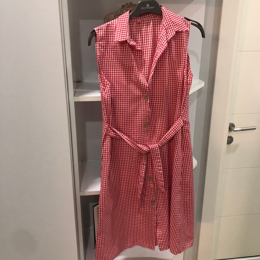 #RED QUEN S M BEDENE Kırmızı kareli, kolsuz midi elbise, bel detaylı ve V yakalı. Düğmeli ön kısmı ve yumuşak dokulu kumaşıyla günlük kullanıma uygun. İki arası 48 boy 95