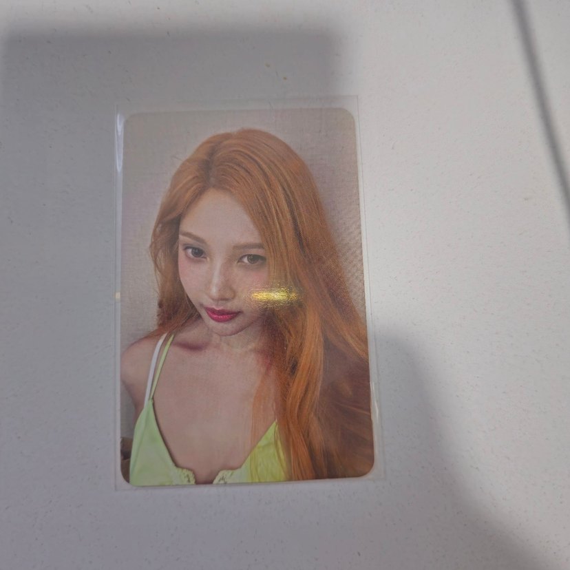 Uzun turuncu saçları olan bir kadının fotoğrafının bulunduğu kart, açık yeşil üst giymiş.