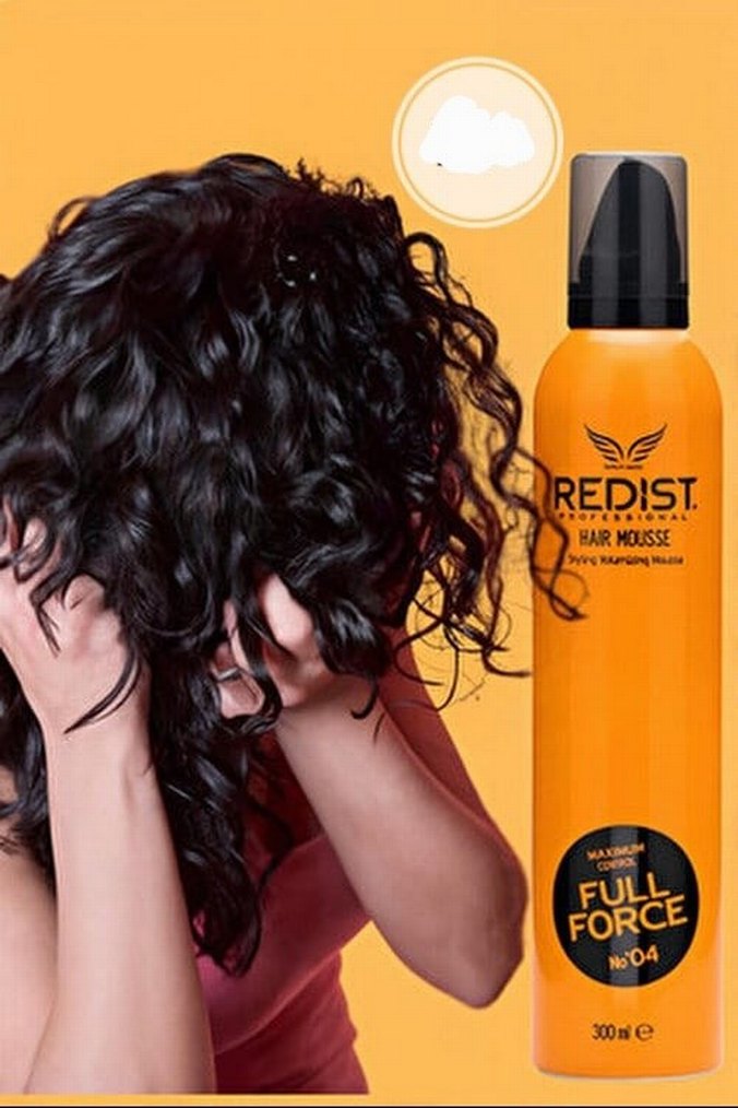 Redist Full Force saç köpüğü, kıvırcık saçlar için güçlü tutuş sağlar ve şekillendirilmiş hacmi korur. 300 ml turuncu şişede sunulur.