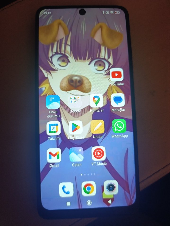 Canlı ekranlı, çok renkli Android telefon. WhatsApp, Galeri ve YouTube gibi uygulamalar yüklü. Anime duvar kağıdında köpek filtresi bulunuyor.