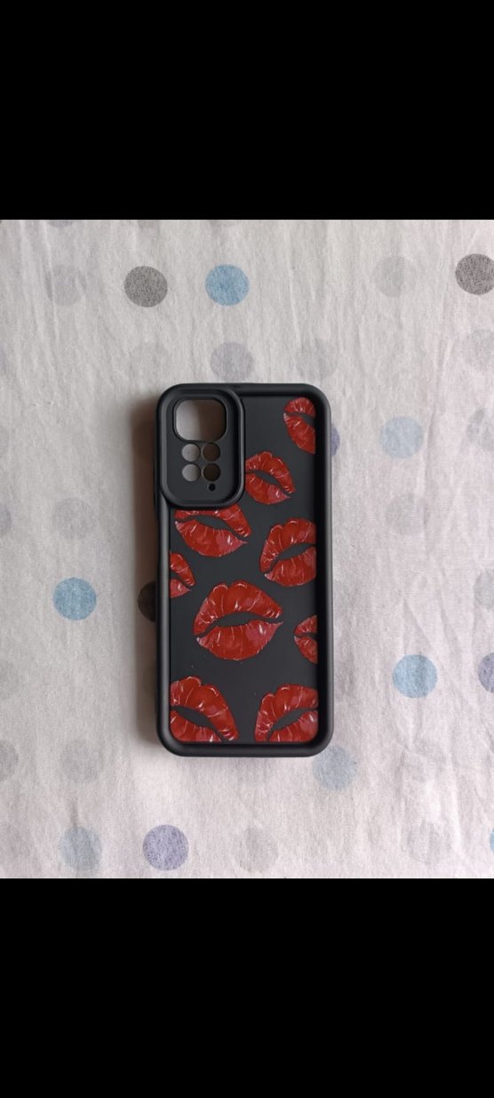 Parlak yüzeye sahip koyu gotik stil telefon kılıfı, canlı kırmızı öpücük desenleriyle dikkat çekiyor. Telefonu korur ve şık bir görünüm sağlar.