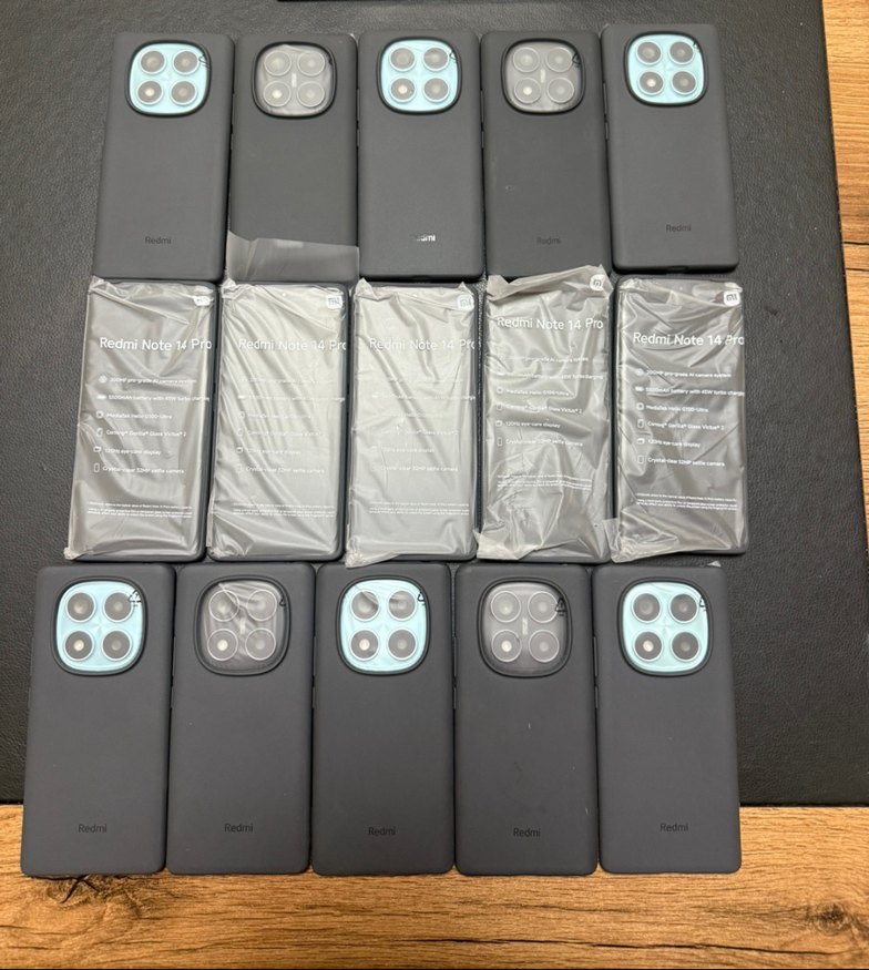 Redmi Note 14 Pro Android telefonlar, çoklu arka kameralar ve mat yüzeylere sahiptir. Bazıları koruyucu ambalajındadır.