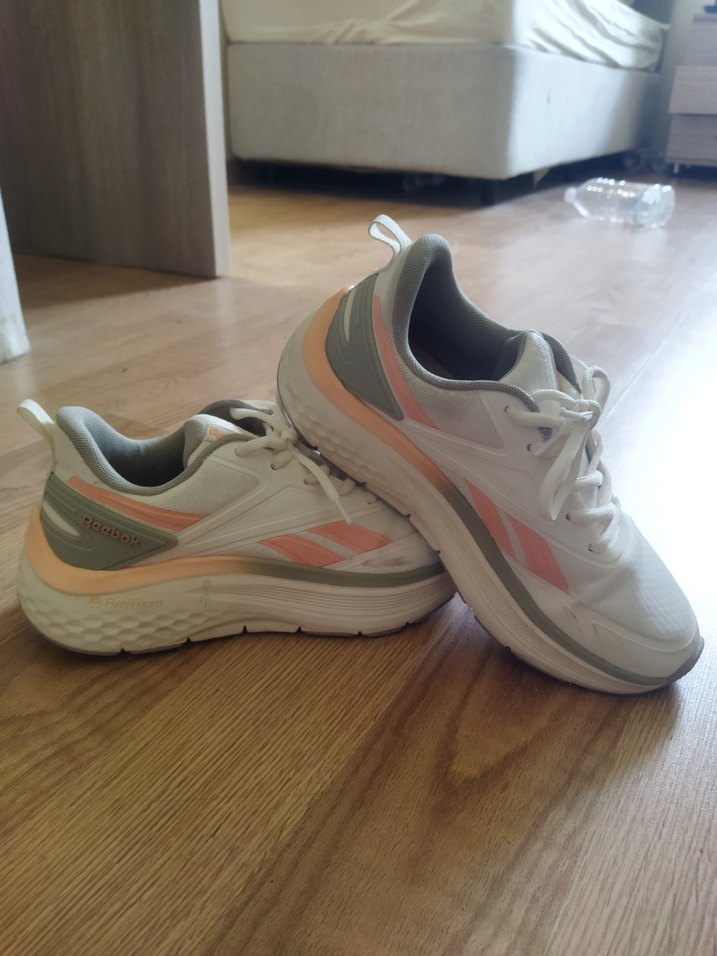Beyaz ve pastel renk detaylı, bağcıklı kadın spor ayakkabısı. Kauçuk tabanlı, sokak stiline uygun. Neredeyse hiç kullanılmadı, numarası bana uygun değil.