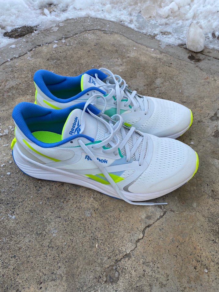 Reebok marka beyaz erkek koşu ayakkabısı, kauçuk tabanlı, hafif renk detaylı ve ayarlanabilir cırt cırtlı bantlıdır. Spor ve sokak giyimine uygundur.