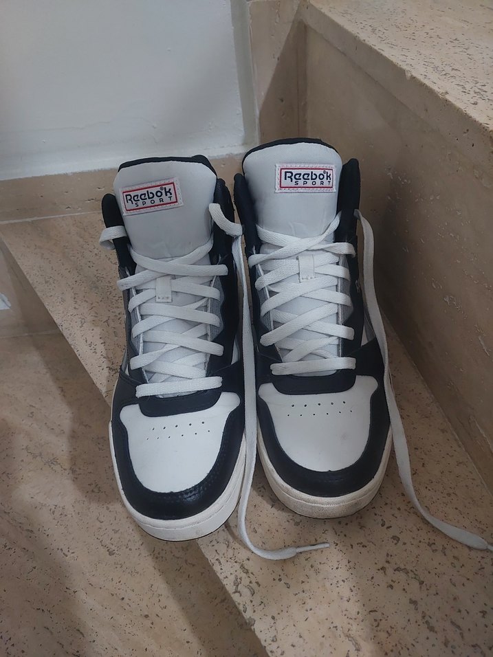 Reebok beyaz ve gri renkli, cırt cırtlı kayışlara ve kauçuk tabanlara sahip basketbol ayakkabısıdır.