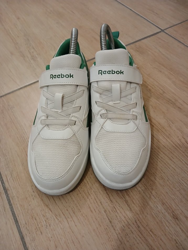 Reebok markalı beyaz kadın spor ayakkabısı, renkli baskılı ve cırt cırtlı tasarıma sahip, dolgu topuklu ve kauçuk tabanlı.