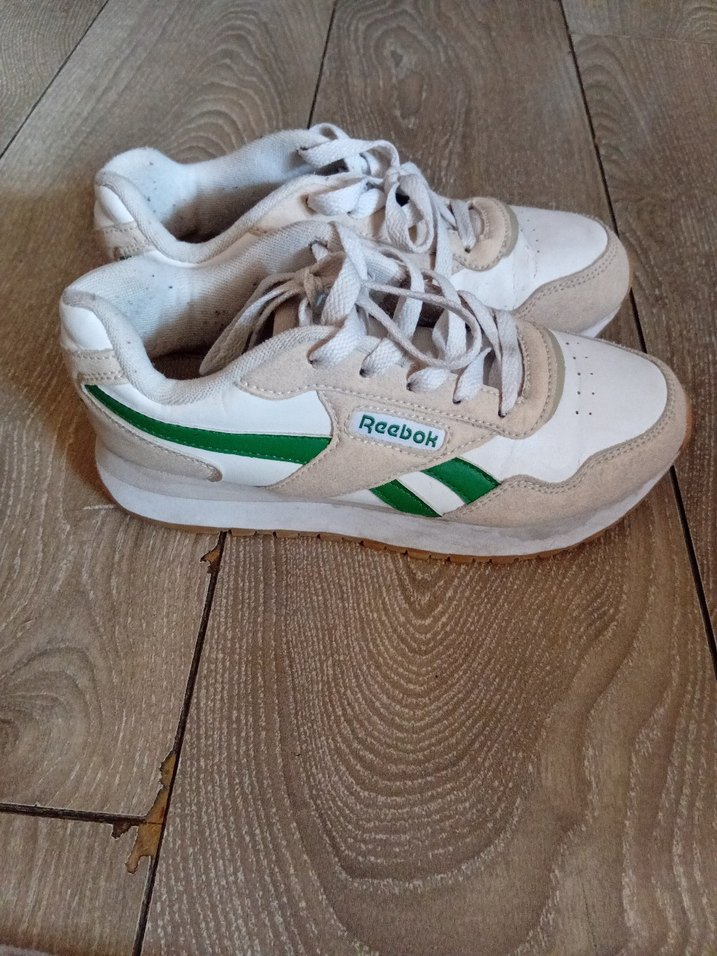 Beyaz ve yeşil tonlarda Reebok platform topuklu spor ayakkabı, cırt cırt detaylı, rahat kauçuk tabanlı, sportif sokak stiline uygun.