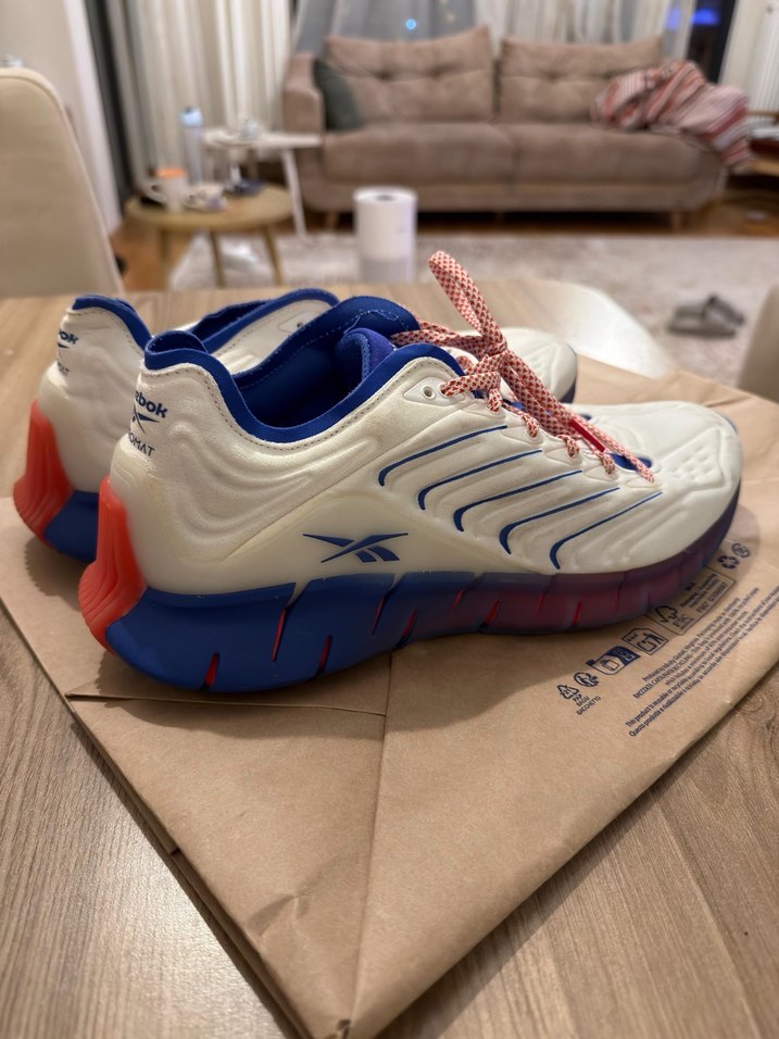 Beyaz tabanlı, renkli baskılı ve elastik detaylı erkek spor ayakkabısı, kauçuk tabanıyla dayanıklılık ve tutuş sağlar.