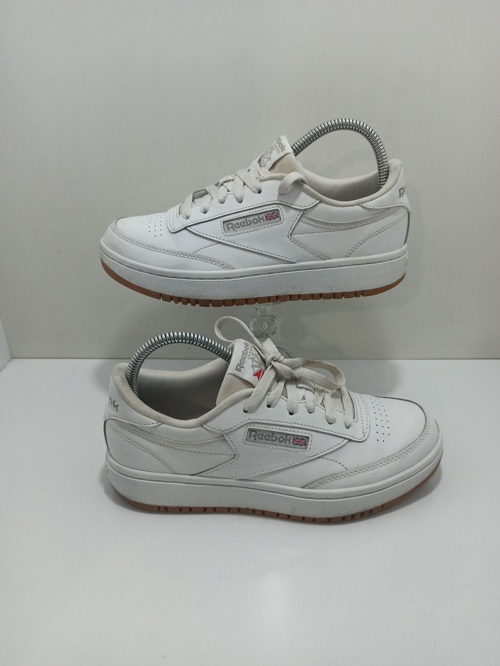 Beyaz Reebok kadın spor ayakkabısı, platform topuklu, kauçuk tabanlı, rahat ve şık sokak stili için uygundur.