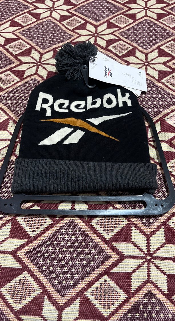 Reebok markalı siyah örgü bere, içi yumuşak ve sıcak tutan fleece kumaşlıdır, üstünde ponpon bulunur, rahat ve trend sokak tarzına uygundur.