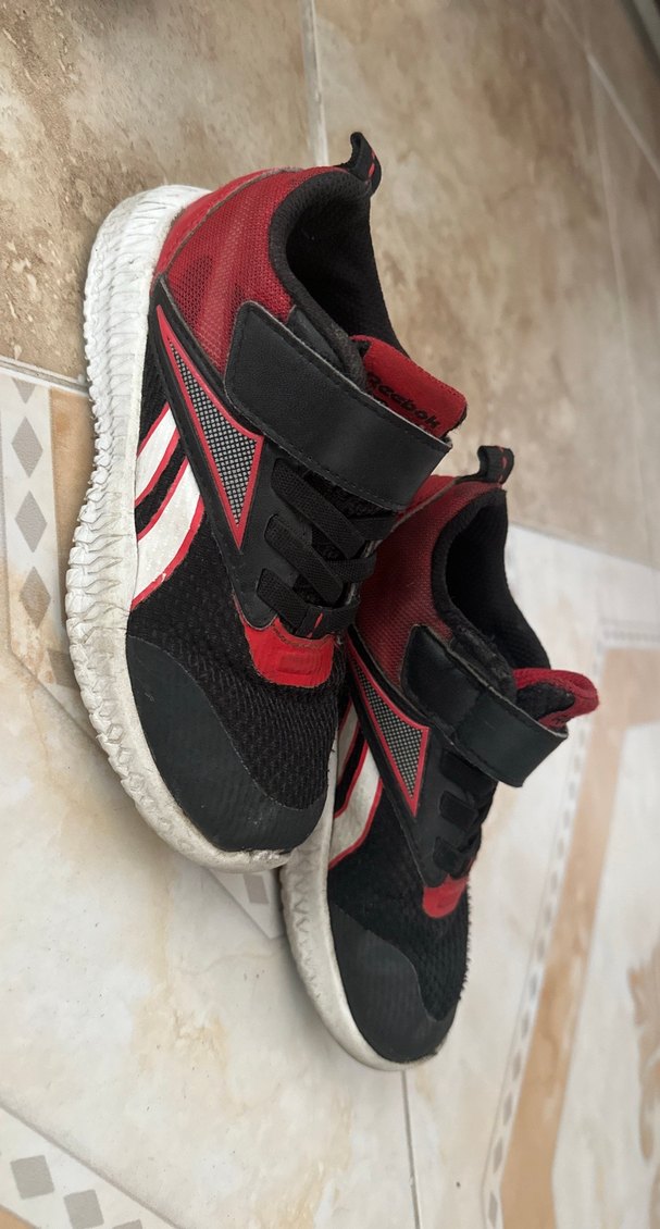 Koyu kırmızı renkli, kaymaz tabanlı ve Velcro bantlı erkek çocuk spor ayakkabısı. Rock punk tarzını yansıtan desensiz tasarım. Herhangı bir kusuru yoktur. Küçük geldıgı için satıyorum çok rahat bır ayakkabı.