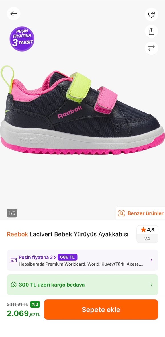 Velcro bantlı, çok renkli kız çocuk spor ayakkabısı. Kauçuk tabanlı, baskılı ve sokak modasına uygun tarzda. 22.5 ama biz 23 numarada kullandık. İç tabanı tam 14.5 cm. Rahat kalıp. Hiçbir kusuru yok. 4-5 kez giyildi. Yepyeni. Koyu lacivert. Reebok Weebok serisi Flodan alındı. Hiç makineye atılmadı. Cırtcırtları hala sert ve dayanıklı. İlk günki gibi.