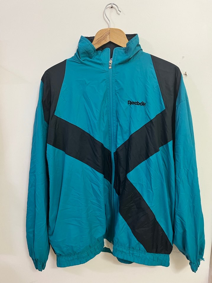Reebok marka, fermuarlı, uzun kollu, notched lapel yakalı, sentetik kumaştan yapılmış, mavi siyah renkte, bol kesim spor rüzgarlık.